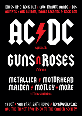 All ticket profits went to the Cancer Society of New Zealand and as the bands, DJs, crew, sound guy, lighting guy & venue did it all for next-to-nothing, Rocktober raised a huge $2,850 thanks to you! Managing that figure without having any financial sponsorship this time is a tribute to all of you who came along, top marks. Party on.